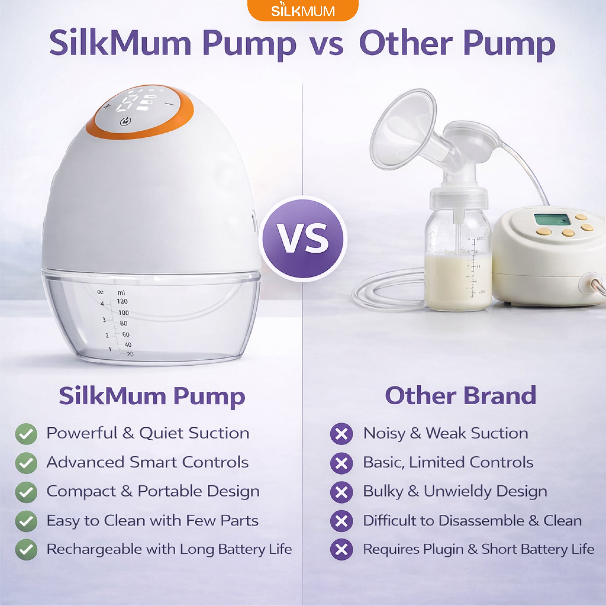 - Ultra-quiet & portable: <45 dB operating noise; lightweight for concealed pumping (~240 g).