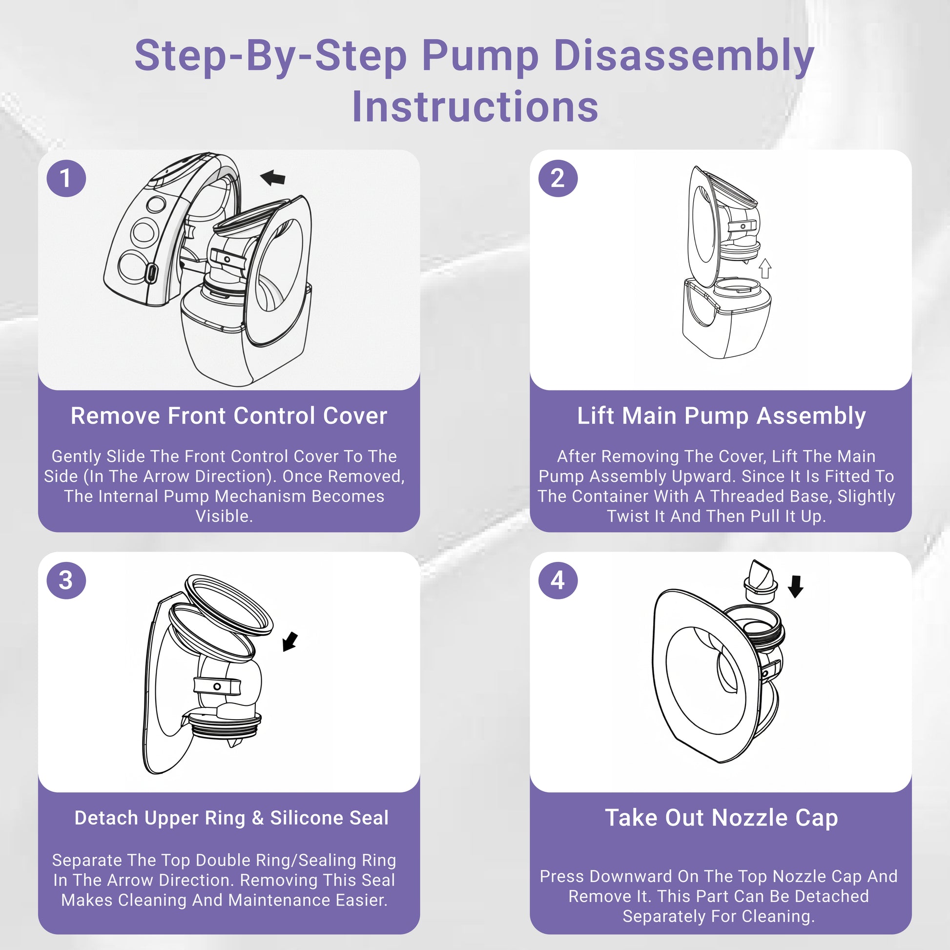 - Disassemble: remove the collection bottle, bottle protector, breast shield, silicone diaphragm/duckbill valve, and cap.
